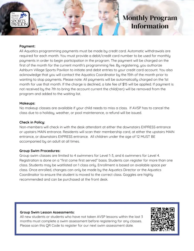 All swimmers new to the AVSP swim program or swimmers who have not been enrolled in the program in three months will need to take a swim assessment, regardless of swim level. Assessments are required to enroll in a group swim program.