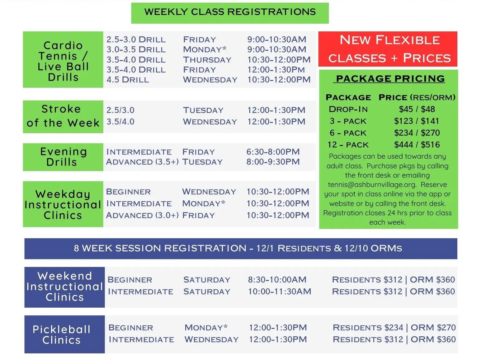 * Get your classes at a discount by purchasing a Practice Package. All Packages are good for one year from date of purchase and can be applied towards all Adult Racquet Sport Classes. Purchase your package today by calling the Front Desk or emailing Tennis@Ashburnvillage.org . Packages cannot be applied towards private lessons.*