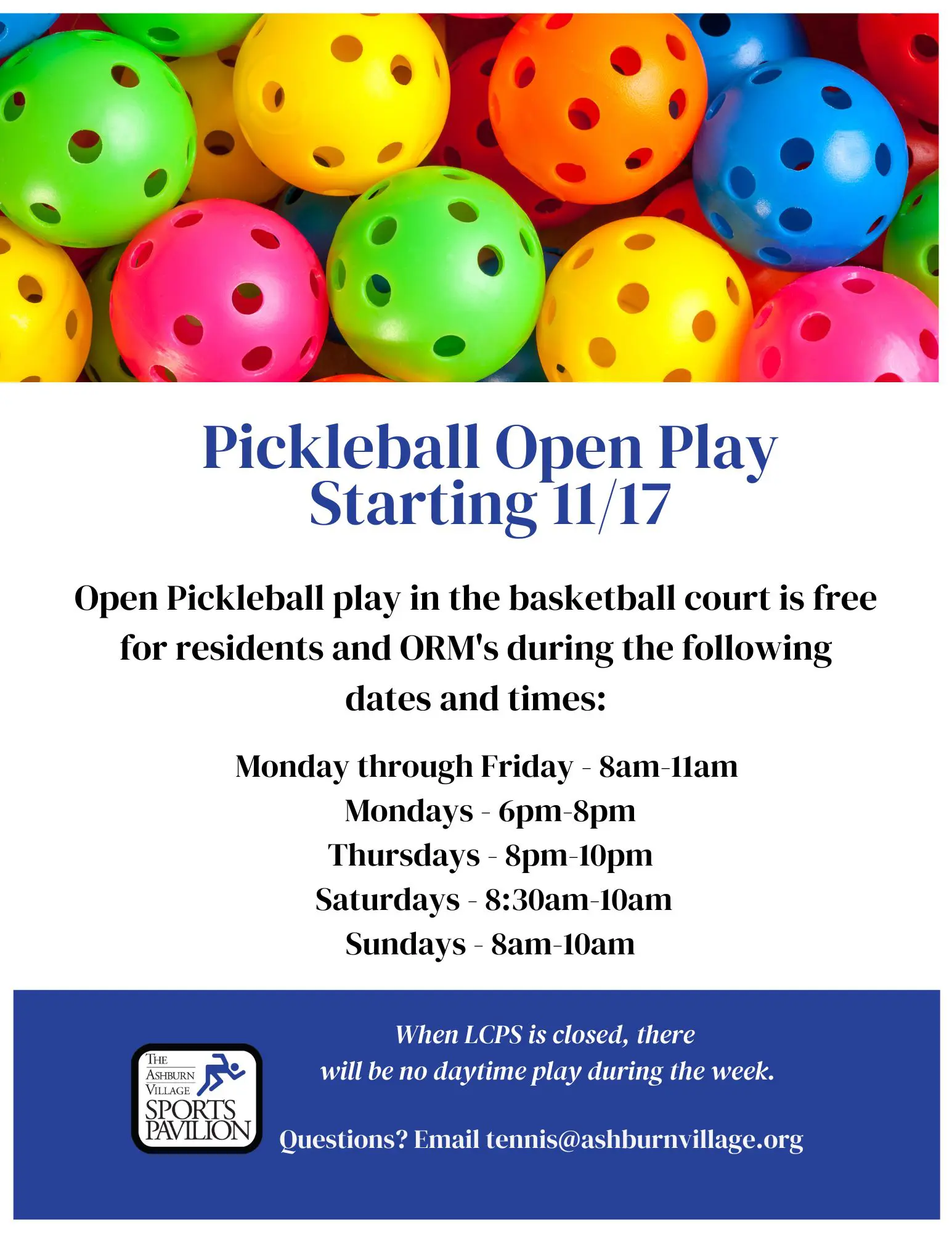 Open Play Pickleball is a great way to get involved in the sport and meet the Ashburn Villagers. Rotate players and enjoy competitive play!